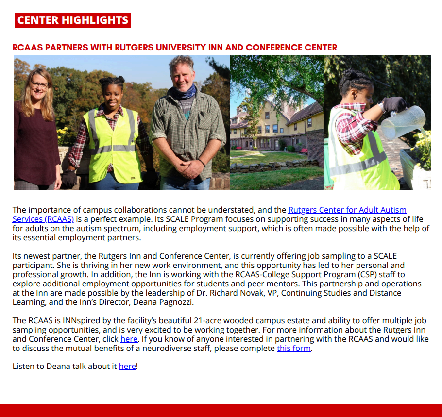 We are thrilled to be partnering with the Rutgers Center for Adult Autism Services (RCAAS), a university division focused on supporting adults on the autism spectrum with one-of-a-kind programs that make an independent and fulfilling life possible. This partnership provides us with an exceptional opportunity to expand our awareness, knowledge, and experience in successfully hiring and staffing a neurodiverse workforce. A working connection with RCAAS’s College Support Program keeps us close for exploring additional employment opportunities for students and peer mentors.